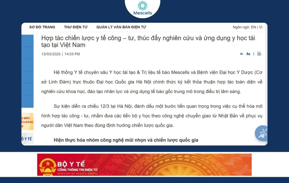 Mescells tự hào là đơn vị tiên phong tại Việt Nam sở hữu hệ sinh thái khép kín và chuyên sâu về công nghệ tế bào gốc. Với nền tảng pháp lý vững chắc và năng lực chuyên môn cao, Mescells đang từng bước khẳng định uy tín và vị thế hàng đầu trong lĩnh vực y học tái tạo.
